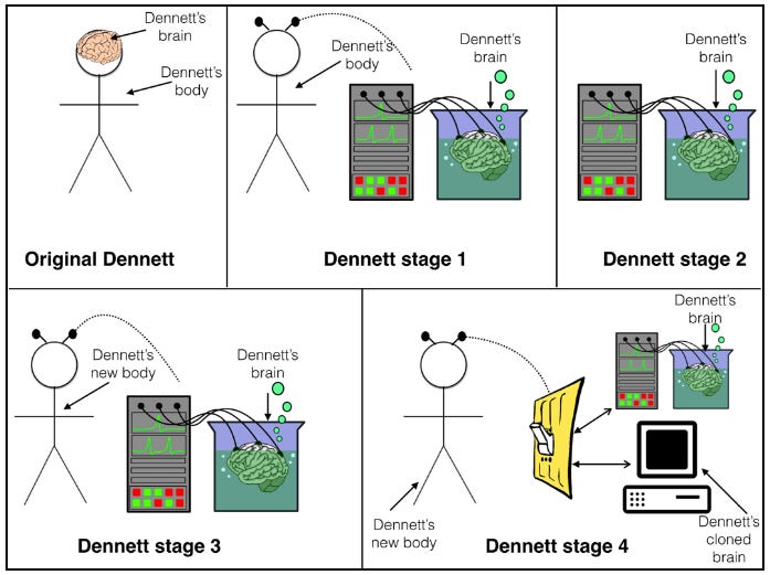 عندما نظر دانيت إلى جسده أمام الوعاء، تساءل: هل أنا حيث جسدي (Dan) يقف؟ أم أنا في المكان الذي يوجد فيه دماغي (Brain)؟